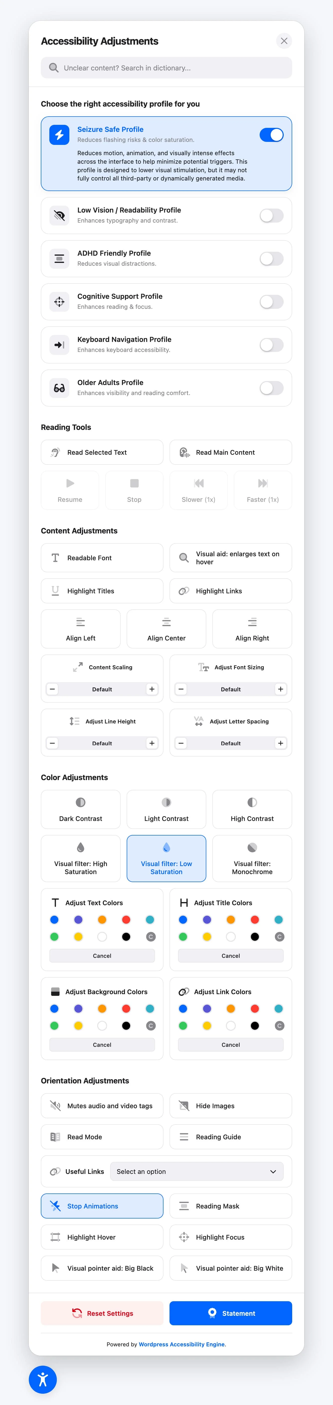- Included presets such as Seizure Safe Profile, Low Vision / Readability Profile, ADHD Friendly Profile, Cognitive Support Profile, Keyboard Navigation Profile, and Older Adults Profile