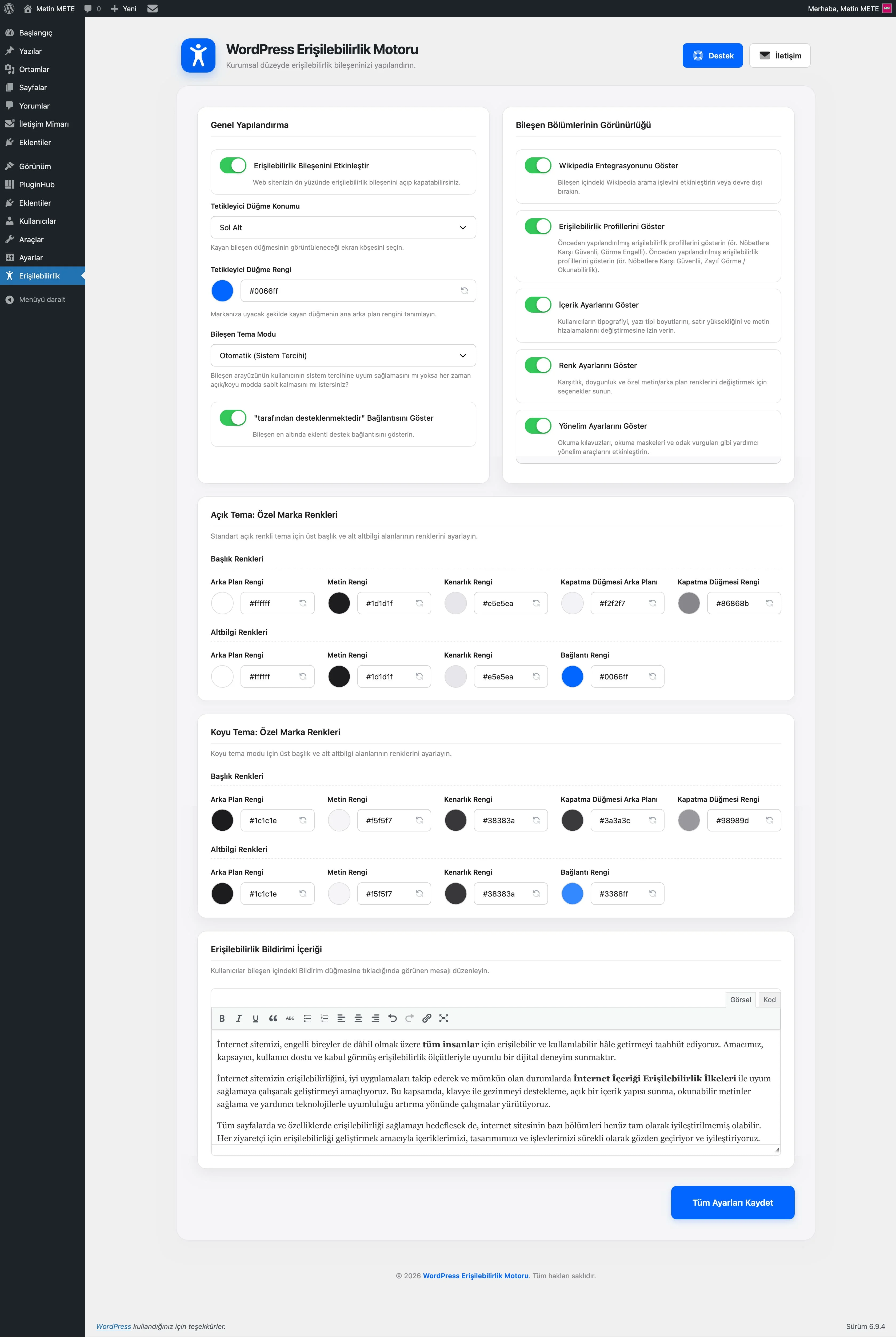 Eklenti içinde yerleşik bir Bildirim bölümü bulunur ve bu bölümün içeriği yönetim alanından düzenlenebilir. Bu yapı, erişilebilirlik yaklaşımınızın görünür ve kullanıcı dostu bir şekilde aktarılmasına yardımcı olur.