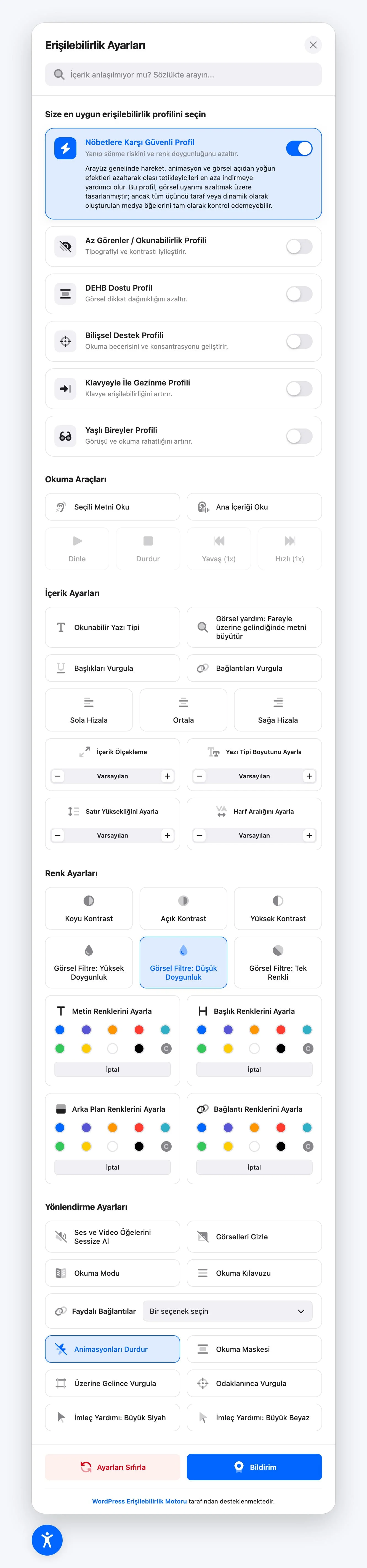 2) Erişilebilirlik profilleri (hazır ayarlar)